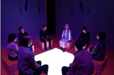 除了人机交互外,艺术家也会将行为表演与AI 技术相结合,此类交互作品多带有一定的叙事性 ,观众可以通过手势、语音识别、眼球追踪等技术来带入情节、展开互动,但并不能决策作品走向,作品《Unlearning Language"遗忘语言》是 Lauren Lee McCarthy & Kyle McDonald 共同完成的表演项目,作品试图探索语言对我们意味着什么?随着人工智能生成的文本激增,我们不断被检测和存档,我们能否想象一个超越持续监控的未来?Unlearning Language 是一个行为装置,它利用机器学习来激发我们寻找对语言的新理解,这种理解是算法无法检测到的。作品由两部分组成:1.最多可容纳 8 人的交互装置,一组参与者受到一台希望训练人类更不像机器的人工智能的引导。当参与者进行交流时,他们会被检测(使用语音检测、手势识别和表情检测),然后AI 会通过光、声音和振动进行干预。整个团体必须共同努力,找到一种新的交流方式,对算法不可察觉。这可能包括拍手或哼唱,或者修改语音的速度、音调或发音。通过这种有趣的实验,人们逐渐展现出与机器区别开来的最人性化的特质。他们开始设想一个更重视人类交流的未来。2.面向观众的交互式开场表演。开场表演为装置提供了背景故事。观众被鼓励彼此互动,以及与表演者进行互动。