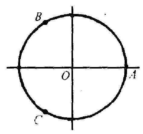 - 最简单的做法如下: 从对称考虑出发,不妨把甲取的点定 在图 1 中的 \(A\) 点处. 这时, 为了使题中所说的事件发生, 乙所选的 点必须在图 1 中的 \(B A C\) 弧内, 且 \(\angle B O A\) 和 \(\angle C O A\) 都是 \(120^{\circ}\). 故 概率为 \(2 / 3\).