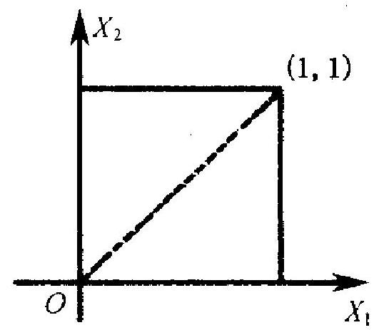 图 2.8 线)上取值. 因而不可能存在一个函数 \(f\left(x_{1}, x_{2}\right)\) 满足 (2.6) 式 (二元函数在平面上任一线段上的积分都 是 0\()\), 即 \(\left(X_{1}, X_{2}\right)\) 的概率密度函数不存在.