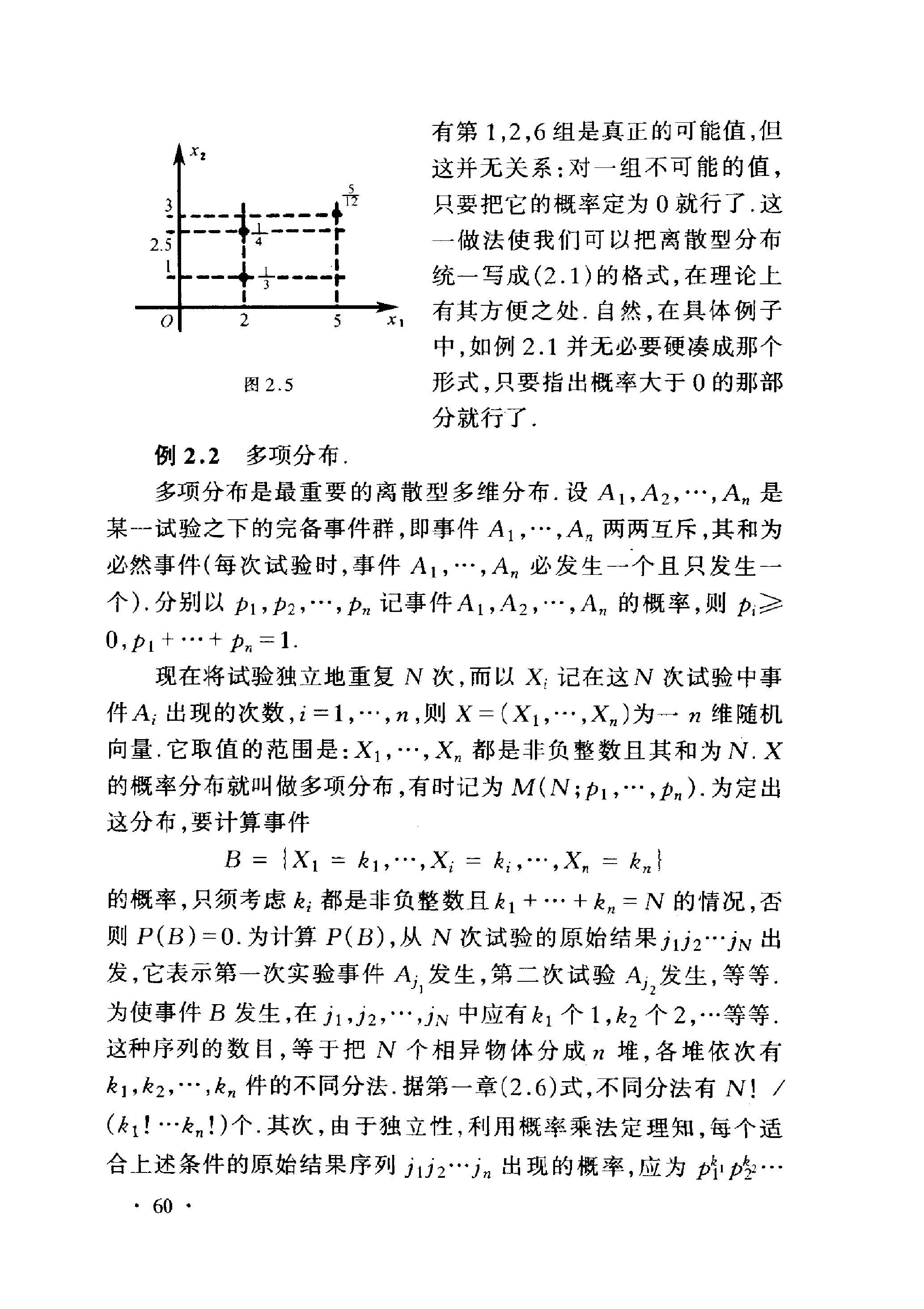 有第 \(1,2,6\) 组是真正的可能值,但 这并无关系: 对一组不可能的值, 只要把它的概率定为 0 就行了. 这 一做法使我们可以把离散型分布 统一写成 \((2.1)\) 的格式, 在理论上 有其方便之处. 自然, 在具体例子 中,如例 2.1 并无必要硬凑成那个 形式, 只要指出概率大于 0 的那部 分就行了.
