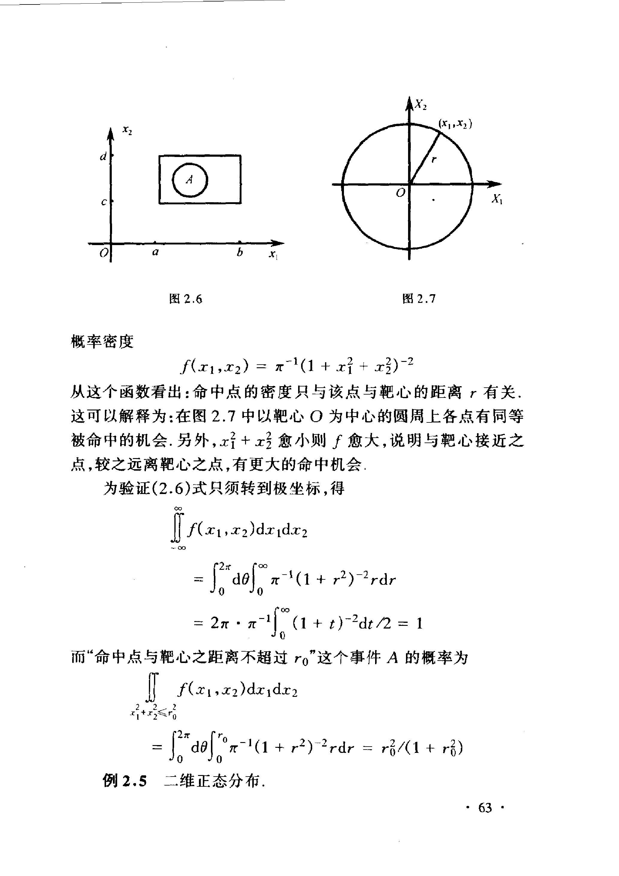 从这个函数看出: 命中点的密度只与该点与靷心的距离 \(r\) 有关. 这可以解释为: 在图 2.7 中以靷心 \(O\) 为中心的圆周上各点有同等 被命中的机会. 另外, \(x_{1}^{2}+x_{2}^{2}\) 愈小则 \(f\) 愈大, 说明与靶心接近之 点, 较之远离靶心之点, 有更大的命中机会.