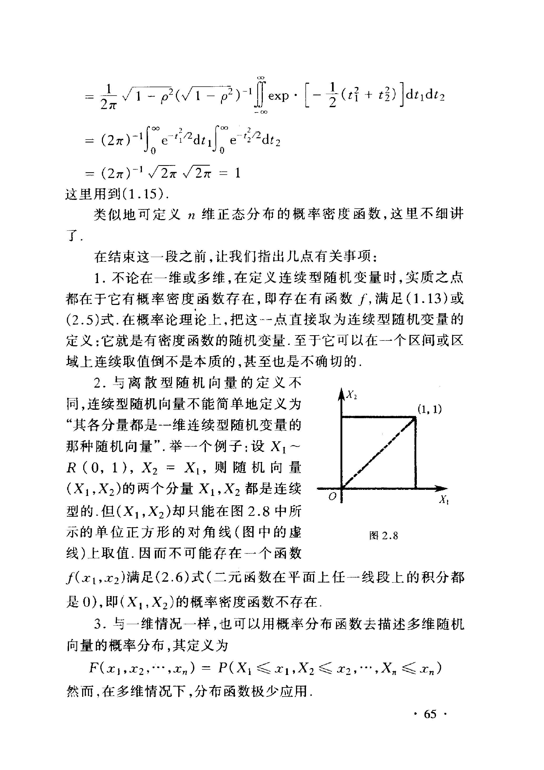 - 与离散型随机向量的定义不 同,连续型随机向量不能简单地定义为 “其各分量都是一维连续型随机变量的 那种随机向量”。举一个例子: 设 \(X_{1}\) ~ \(R(0,1), X_{2}=X_{1}\), 则随机 向量 \(\left(X_{1}, X_{2}\right)\) 的两个分量 \(X_{1}, X_{2}\) 都是连续 型的. 但 \(\left(X_{1}, X_{2}\right)\) 却只能在图 2.8 中所 示的单位正方形的对角线 (图中的虚