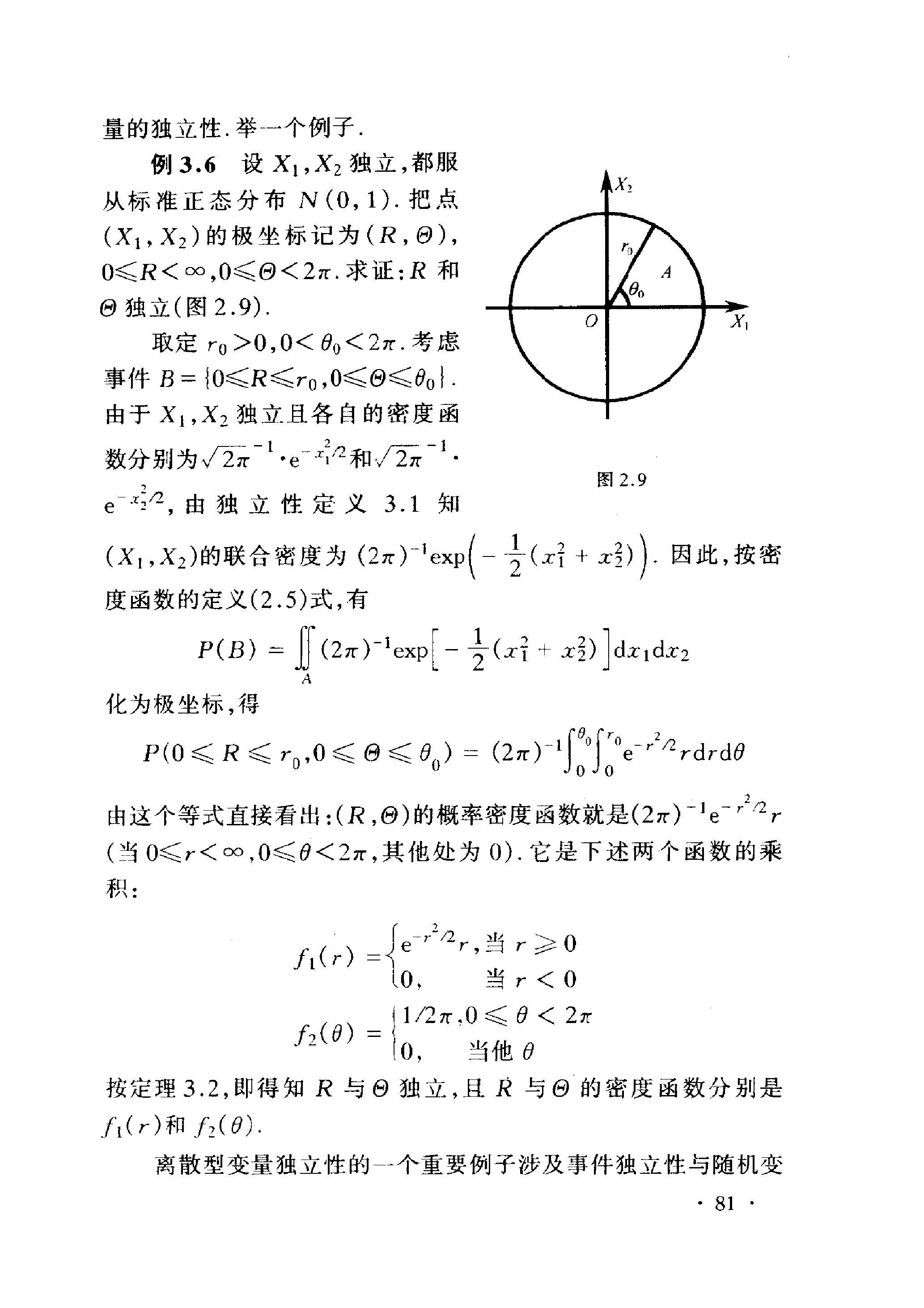 按定理 3.2 , 即得知 \(R\) 与 \(\Theta\) 独立, 且 \(R\) 与 \(\Theta\) 的密度函数分别是 \(f_{1}(r)\) 和 \(f_{2}(\theta)\).