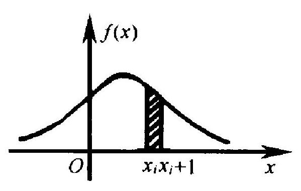 这个定义可以用离散化的方式 来加以解释. 如图 3.1, 在 \(x\) 轴上用 密集的点列 \(\left\{x_{i}\right\}\) 把 \(x\) 轴分成很多小 区间,长为 \(x_{i+1}-x_{i}=\Delta x_{i}\). 当 \(X\) 取 值于区间 \(\left[x_{i}, x_{i+1}\right)\) 内时, 可近似地 认为其值就是 \(x_{i}\). 按密度函数的定 义, \(X\) 取上述区间内之值的概率, 即 图中斜线标出部分的面积, 近似地为 \(f\left(x_{i}\right) \Delta x_{i}\). 用这个方式, 我们把原来的连续型随机变量 \(X\) 近似地 离散化为一个取无穷个值 \(\left\{x_{i}\right\}\) 的离散型变量 \(X^{\prime}, X^{\prime}\) 的分布为 \(P\left(X^{\prime}=x_{i}\right) \approx f\left(x_{i}\right) \Delta x_{i}\), 按定义 1.2 , 有