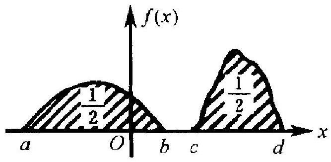 二是中位数本身所固有的某些缺点. 首先, 中位数可以不唯 一. 例如, 考察图 3.2 的密度函数 \(f\). 它只在两个分开的区间 \((a\), \(b)\) 和 \((c, d)\) 内不为 0 , 且在这两段区间上围成的面积都是 \(1 / 2\). 这 时, 按中位数的定义 1.4 , 区间 \([b, c]\) 中任何一点 \(m\) 都是中位数. 它没有一个唯一的值.