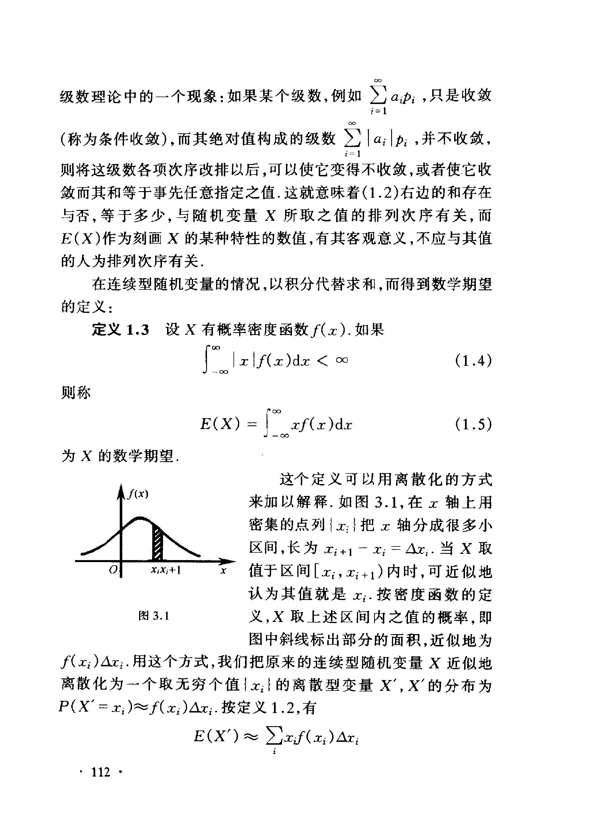 为什么不就要求 \((1.2)\) 右边收玫而必须要求 (1.3)? 这就涉及 级数理论中的一个现象: 如果某个级数, 例如 \(\sum_{i=1}^{\infty} a_{i} p_{i}\), 只是收玫 (称为条件收敛), 而其绝对值构成的级数 \(\sum_{i=1}^{\infty}\left|a_{i}\right| p_{i}\), 并不收敛, 则将这级数各项次序改排以后, 可以使它变得不收玫, 或者使它收 敛而其和等于事先任意指定之值. 这就意味着 (1.2)右边的和存在 与否, 等于多少, 与随机变量 \(X\) 所取之值的排列次序有关, 而 \(E(X)\) 作为刻画 \(X\) 的某种特性的数值, 有其客观意义, 不应与其值 的人为排列次序有关.