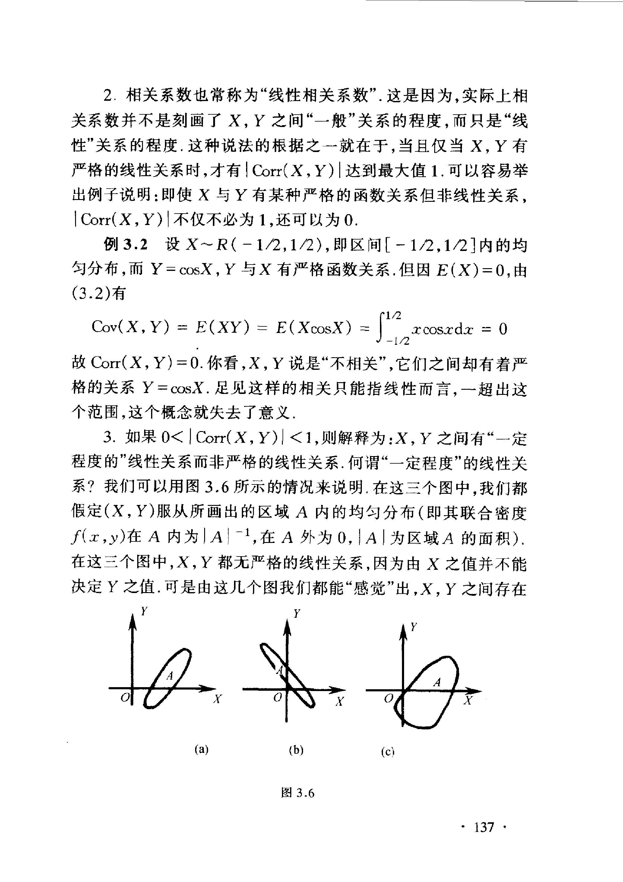 故 \(\operatorname{Corr}(X, Y)=0\). 你看, \(X, Y\) 说是“不相关”, 它们之间却有着严 格的关系 \(Y=\cos X\). 足见这样的相关只能指线性而言, 一超出这 个范围, 这个概念就失去了意义。