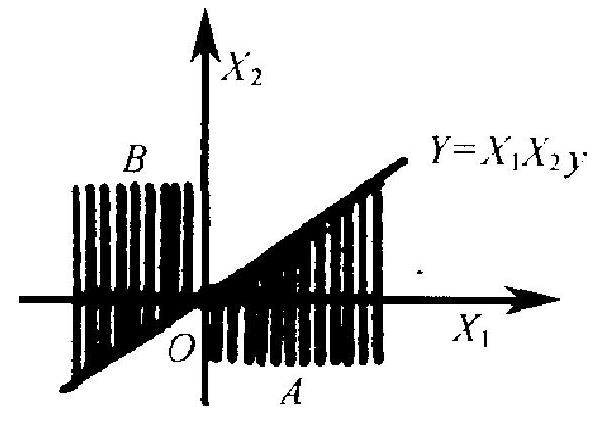 - 计算 \(Y=X_{1} X_{2}\) 的分布 函数 \(F(y)=P(Y \leqslant y)\). 事件 \(\{Y\) \(\leqslant y\}\) 相应于 \(\left(X_{1}, X_{2}\right)\) 落在图 5 中 的区域 \(A\) 或 \(B\) 内. 因此有
