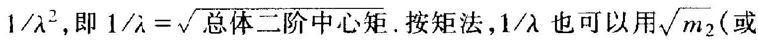 例 2.2 设 \(X_{1}, \cdots, X_{n}\) 是从指数分布总体中抽出的样本, 要 估计参数 \(\lambda\) 的倒数 \(1 / \lambda\). 前已指出: \(1 / \lambda\) 就是总体分布的均值, 故 按矩法, 就用 \(\bar{X}\) 去估计之. 如要估计的是参数 \(\lambda\) 本身, 就用 \(1 \bar{X}\).