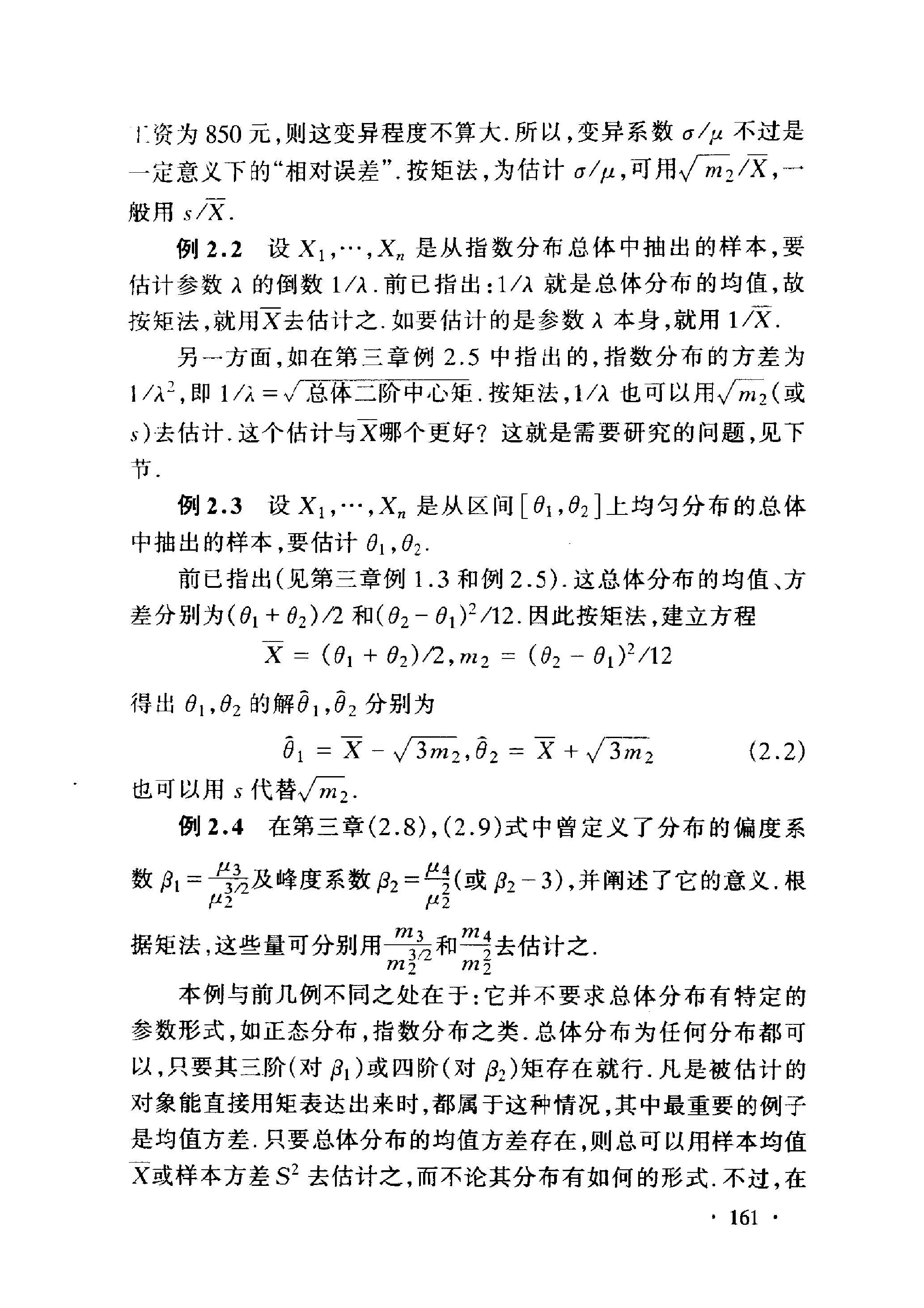 本例与前几例不同之处在于: 它并不要求总体分布有特定的 参数形式, 如正态分布, 指数分布之类. 总体分布为任何分布都可 以, 只要其三阶 (对 \(\beta_{1}\) ) 或四阶 (对 \(\beta_{2}\) ) 矩存在就行. 凡是被估计的 对象能直接用矩表达出来时, 都属于这种情况, 其中最重要的例子 是均值方差. 只要总体分布的均值方差存在, 则总可以用样本均值 \(\bar{X}\) 或样本方差 \(S^{2}\) 去估计之, 而不论其分布有如何的形式. 不过, 在 总体分布已知有某种参数形式时, 总体的均值方差也可以有比 \(\bar{X}\) 或 \(S^{2}\) 更好的估计(见后面有关的例子).