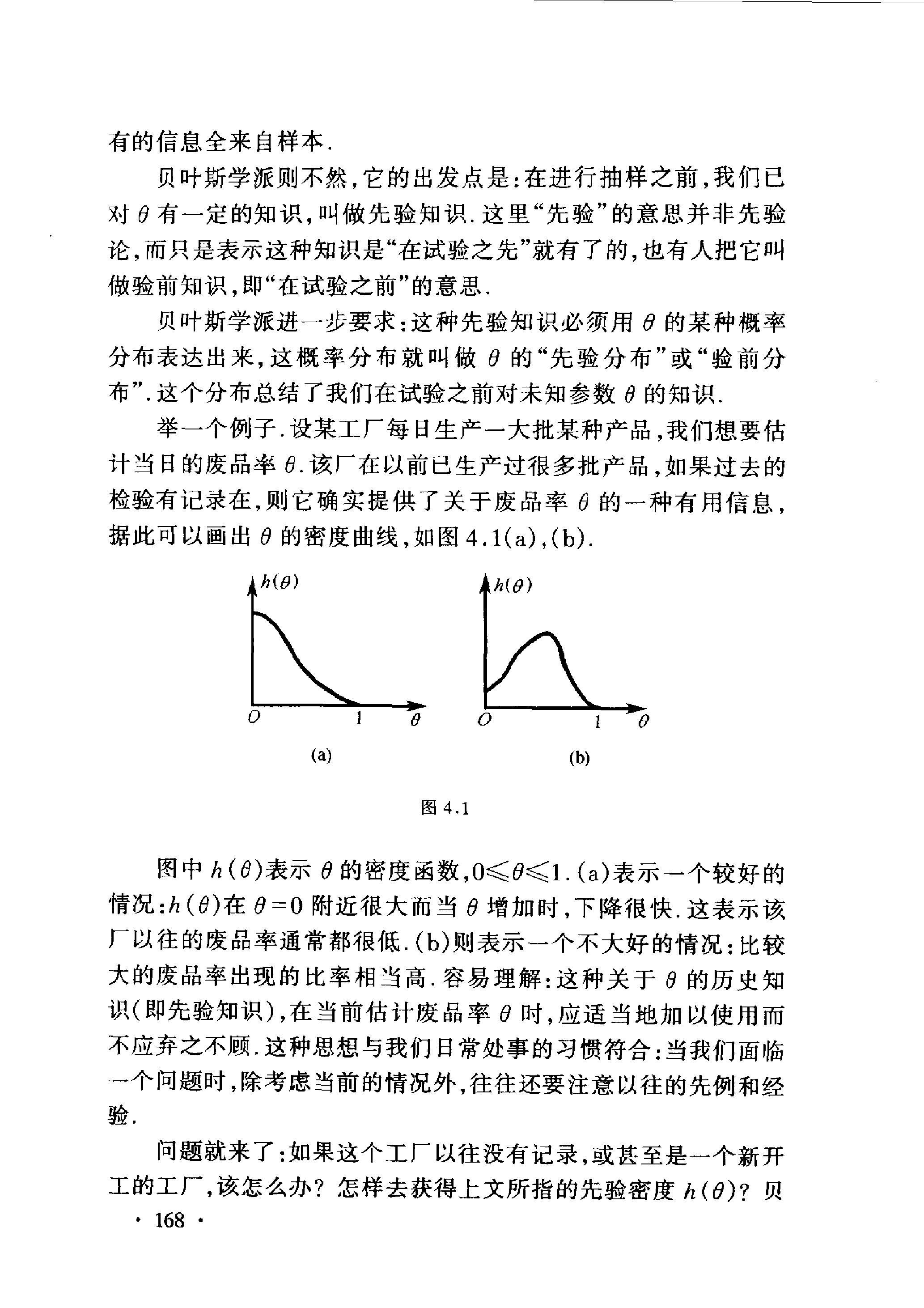 图中 \(h(\theta)\) 表示 \(\theta\) 的密度函数, \(0 \leqslant \theta \leqslant 1\). (a)表示一个较好的 情况: \(h(\theta)\) 在 \(\theta=0\) 附近很大而当 \(\theta\) 增加时,下降很快.这表示该 厂以往的废品率通常都很低. (b)则表示一个不大好的情况: 比较 大的废品率出现的比率相当高. 容易理解: 这种关于 \(\theta\) 的历史知 识 (即先验知识), 在当前估计废品率 \(\theta\) 时, 应适当地加以使用而 不应弃之不顾.这种思想与我们日常处事的习惯符合 : 当我们面临 一个问题时, 除考虑当前的情况外, 往往还要注意以往的先例和经 验。