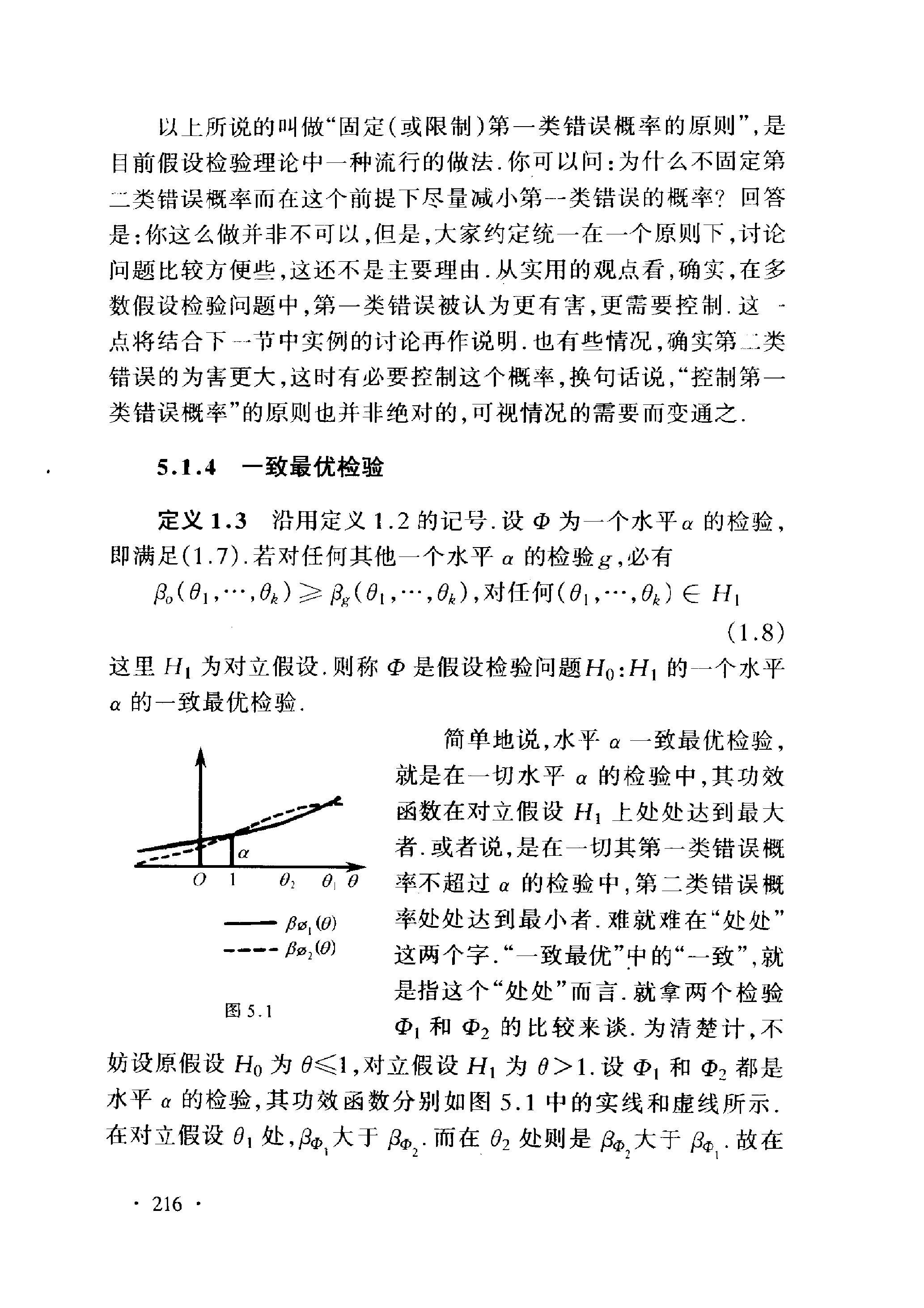 简单地说,水平 \(\alpha\) 一致最优检验, 就是在一切水平 \(\alpha\) 的检验中, 其功效 函数在对立假设 \(H_{1}\) 上处处达到最大 者. 或者说, 是在一切其第一类错误概 率不超过 \(\alpha\) 的检验中, 第二类错误概 率处处达到最小者. 难就难在“处处” 这两个字.“一致最优”中的“一致”, 就 是指这个 “处处”而言. 就拿两个检验 \(\Phi_{1}\) 和 \(\Phi_{2}\) 的比较来谈. 为清楚计, 不 妨设原假设 \(H_{0}\) 为 \(\theta \leqslant 1\), 对立假设 \(H_{1}\) 为 \(\theta>1\). 设 \(\Phi_{1}\) 和 \(\Phi_{2}\) 都是 水平 \(\alpha\) 的检验, 其功效函数分别如图 5.1 中的实线和虚线所示. 在对立假设 \(\theta_{1}\) 处, \(\beta_{\Phi_{1}}\) 大于 \(\beta_{\Phi_{2}}\). 而在 \(\theta_{2}\) 处则是 \(\beta_{\Phi_{2}}\) 大于 \(\beta_{\Phi_{1}}\). 故在 这两个检验 \(\Phi_{1}, \Phi_{2}\) 中, 没有一个在对立假设各点处处优于另一 个. 由于水平 \(\alpha\) 的检验非常多, 其中能有一个一致最优者, 就不是 常见的情况而是较少有的例外, 更确定地说, 只在总体分布只依赖 一个参数 \(\theta\), 而原假设 \(H_{0}\) 是 \(\theta \leqslant \theta_{0}\) 或 \(H_{0}\) 是 \(\theta \geqslant \theta_{0}\) 的情形, 且对 总体分布的形式有一定的限制时, 一致最优检验才存在. 其他情况 则是稀有的例外. 在下节我们讨论一些具体检验时, 将指明哪些是 一致最优检验. 有的情况的证明将在本章附录中给出.