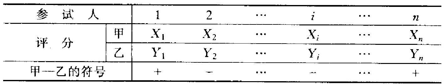 现在看表上最后一行: \(X_{i}-Y_{i}\) 的符号. 这就免除了前面所讲 的可能的缺点, 因为此处只要一个好坏对比的意见, 而不问具体程 度如何,这样就回到了符号检验.