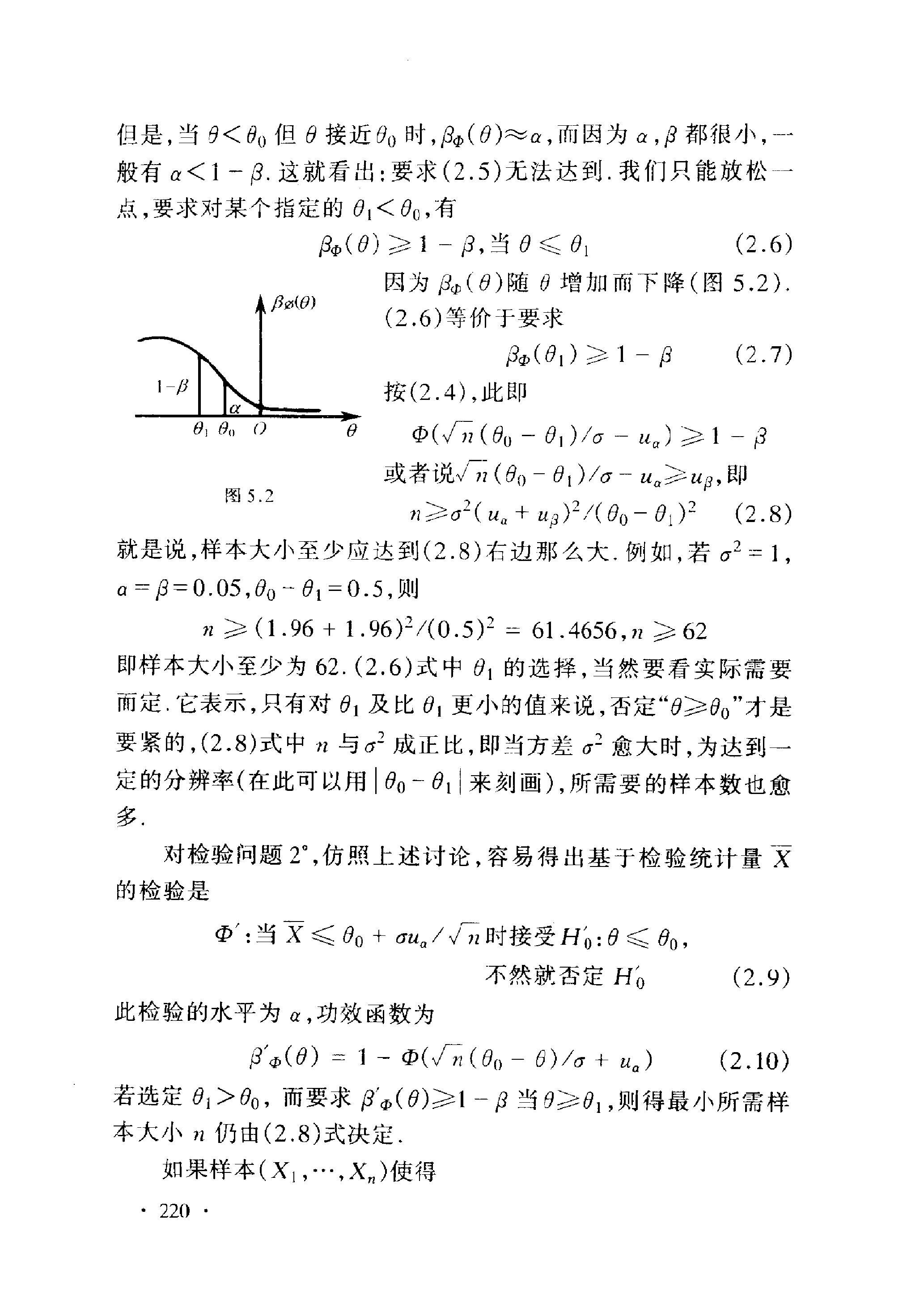即样本大小至少为 62. (2.6) 式中 \(\theta_{1}\) 的选择, 当然要看实际需要 面定. 它表示, 只有对 \(\theta_{1}\) 及比 \(\theta_{1}\) 更小的值来说, 否定“ “ \(\theta \geqslant \theta_{0}\) ” 才是 要紧的, (2.8)式中 \(n\) 与 \(\sigma^{2}\) 成正比, 即当方差 \(\sigma^{2}\) 愈大时, 为达到一 定的分辨率 (在此可以用 \(\left|\theta_{0}-\theta_{1}\right|\) 来刻画), 所需要的样本数也愈 多.