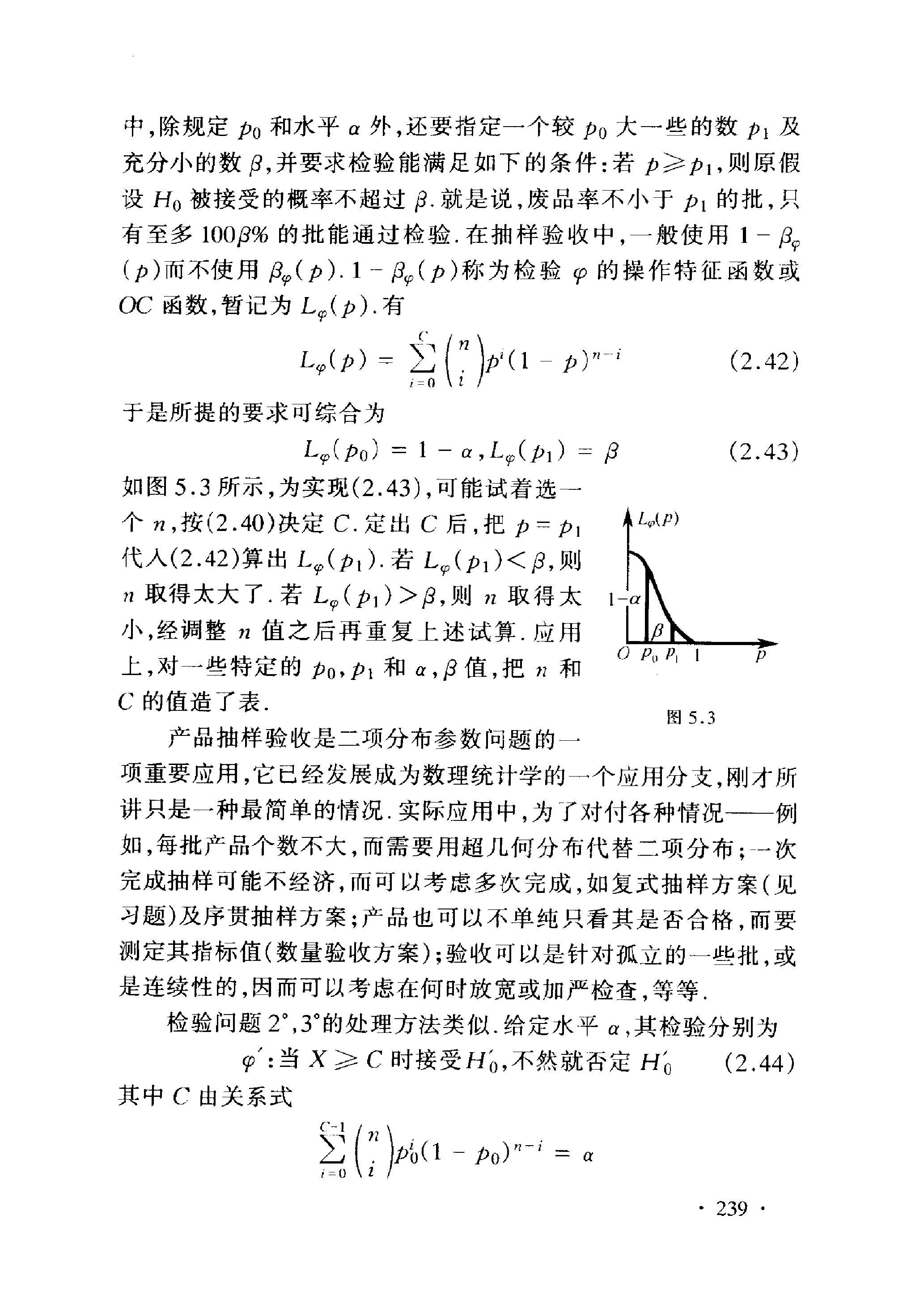 图 5.3 项重要应用, 它已经发展成为数理统计学的一个应用分支, 刚才所 讲只是一种最简单的情况. 实际应用中, 为了对付各种情况一例 如, 每批产品个数不大, 而需要用超几何分布代替二项分布; - 次 完成抽样可能不经济, 而可以考虑多次完成, 如复式抽样方案 (见 习题)及序贯抽样方案; 产品也可以不单纯只看其是否合格, 而要 测定其指标值 (数量验收方案); 验收可以是针对孤立的一些批,或 是连续性的,因而可以考虑在何时放宽或加严检查,等等.