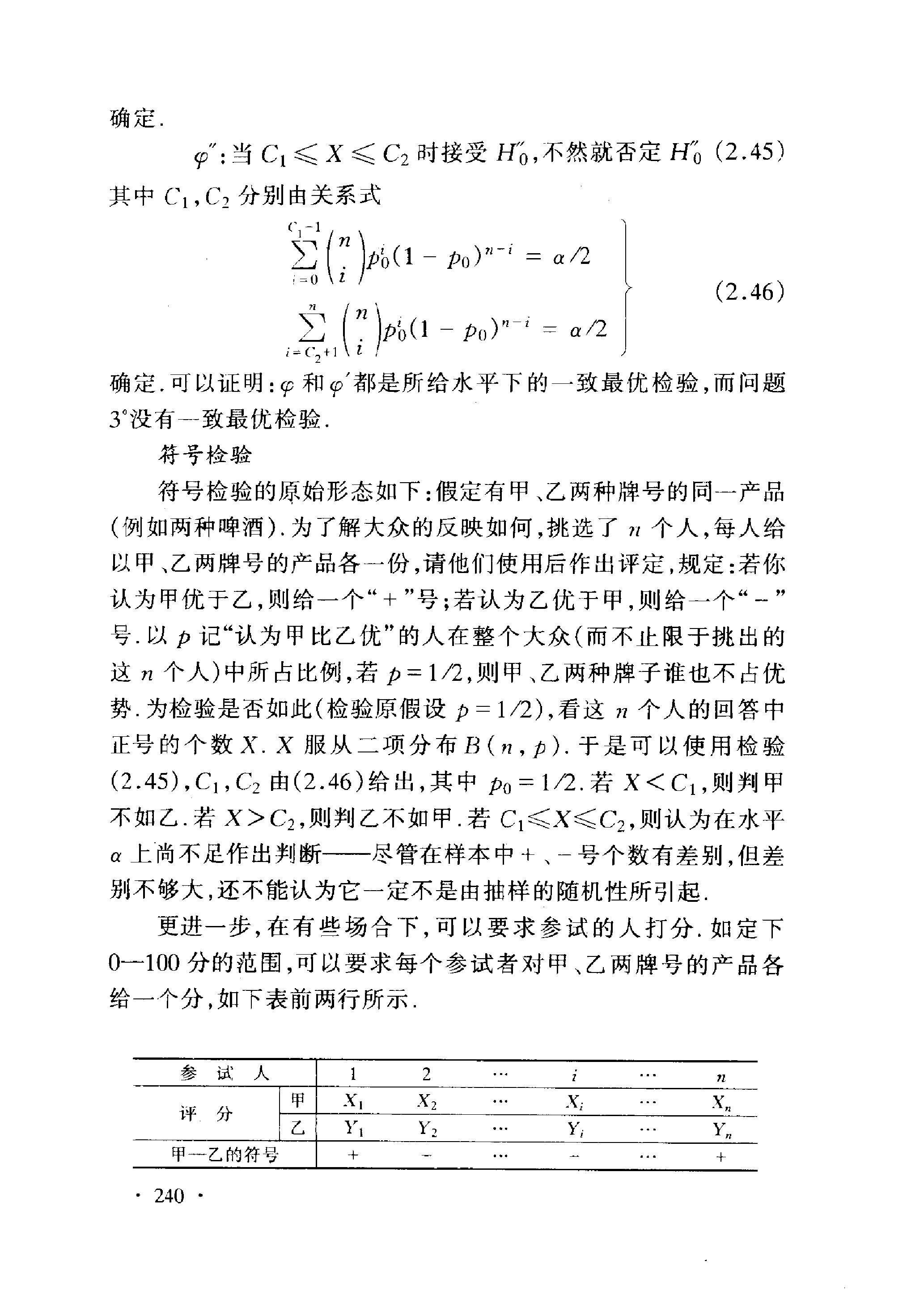 符号检验的原始形态如下: 假定有甲、乙两种牌号的同一产品 (例如两种椑酒). 为了解大众的反映如何, 挑选了 \(n\) 个人, 每人给 以甲、乙两牌号的产品各一份, 请他们使用后作出评定,规定: 若你 认为甲优于乙, 则给一个 “+ ” 号; 若认为乙优于甲, 则给一个 “- ” 号.以 \(p\) 记“认为甲比乙优”的人在整个大众 (而不止限于挑出的 这 \(n\) 个人) 中所占比例, 若 \(p=1 / 2\), 则甲、乙两种牌子谁也不占优 势. 为检验是否如此 (检验原假设 \(p=1 / 2\) ), 看这 \(n\) 个人的回答中 正号的个数 \(X . X\) 服从二项分布 \(B(n, p)\). 于是可以使用检验 (2.45), \(C_{1}, C_{2}\) 由 (2.46) 给出, 其中 \(p_{0}=1 / 2\). 若 \(X<C_{1}\), 则判甲 不如乙. 若 \(X>C_{2}\), 则判乙不如甲. 若 \(C_{1} \leqslant X \leqslant C_{2}\), 则认为在水平 \(\alpha\) 上尚不足作出判断一尽管在样本中+、一号个数有差别, 但差 别不够大, 还不能认为它一定不是由抽样的随机性所引起.