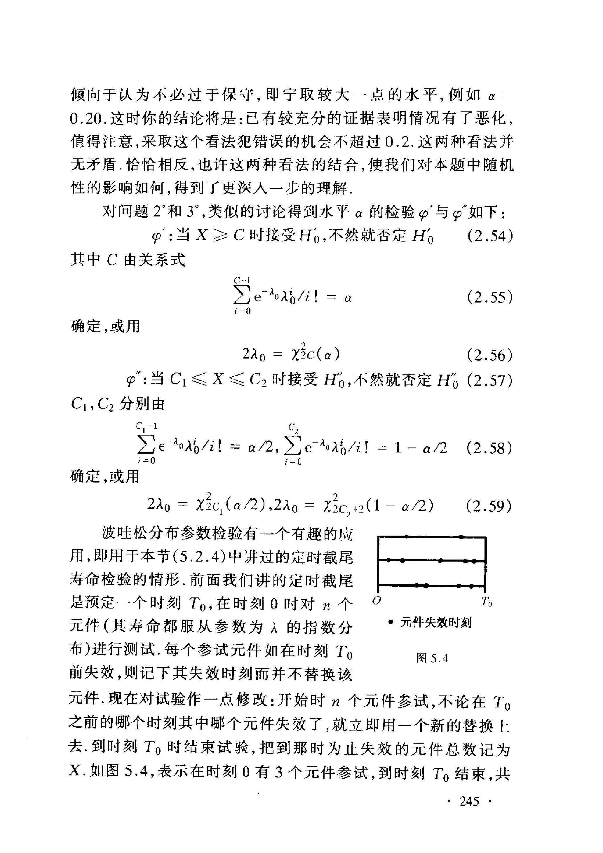 波哇松分布参数检验有一个有趣的应 用, 即用于本节 (5.2.4)中讲过的定时截尾 寿命检验的情形. 前面我们讲的定时截尾 是预定一个时刻 \(T_{0}\), 在时刻 0 时对 \(n\) 个 元件 (其寿命都服从参数为 \(\lambda\) 的指数分 布)进行测试. 每个参试元件如在时刻 \(T_{0}\) 前失效,则记下其失效时刻而并不替换该