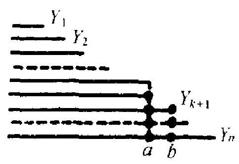 \(2^{\circ}\) 设 \(r=k\) 时结果成立 (归纳假设), 要证明当 \(r=k+1\) 时结果也成立. 为此, 分别用 \(T_{k}\) 和 \(T_{k+1}\) 记当 \(r=k\) 和 \(r=k+1\) 时的 \(T\) 值, 而分析一下二者 的关系, 如右图 5.6, 分别显示出 \(n\) 个元件依次失效时的寿命 \(Y_{1}, \cdots, Y_{n}\). 并 为方便计,把 \(Y_{k}\) 和 \(Y_{k+1}\) 分别记为 \(a\) 和 \(b\). 从图上明显看出:
