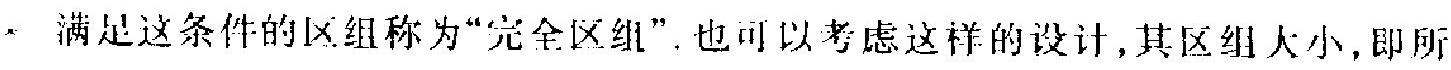 由此可见,不是在任何场合下划分区组都好.若没有足够理由 显示不同区组间确有显著差异, 则宁肯不分. 如以前提过的那个比 较 4 种配方, 由 5 个人操作的例子. 不同的人在操作技术上总多少 会有差异, 但如没有根据认为他们之间有颇大差异, 则分区组不一 定有利. 在实际工作中, 这种界限不易掌握, 这里只能作为一条一 般性的原则谈一下.