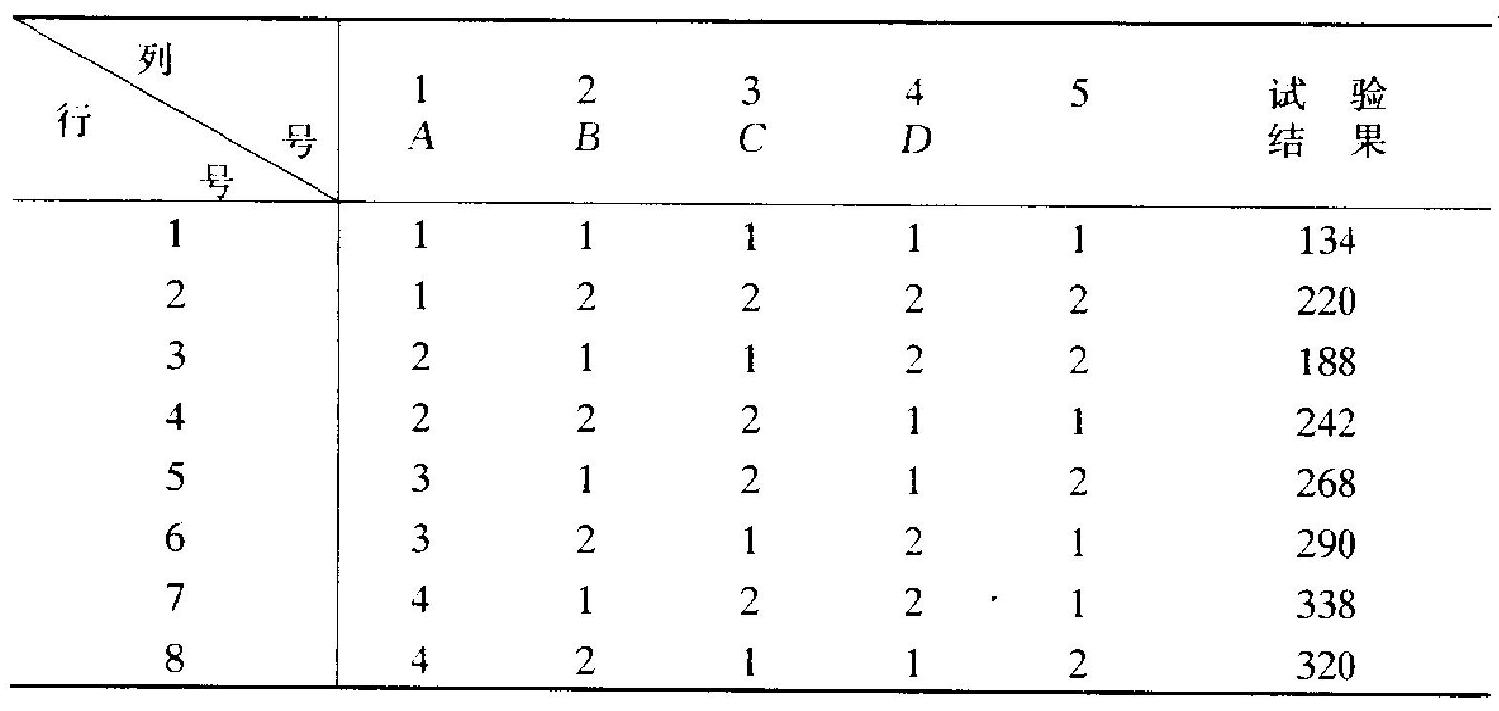 这个表一共有 8 行、5 列. 这两个数字 \((8,5)\) 有其意义: 8 表示 如用这个表安排试验, 则必须做 8 次试验, 不能多也不能少. 5 表 示最多能安排 5 个因素, 不能多, 可以少.