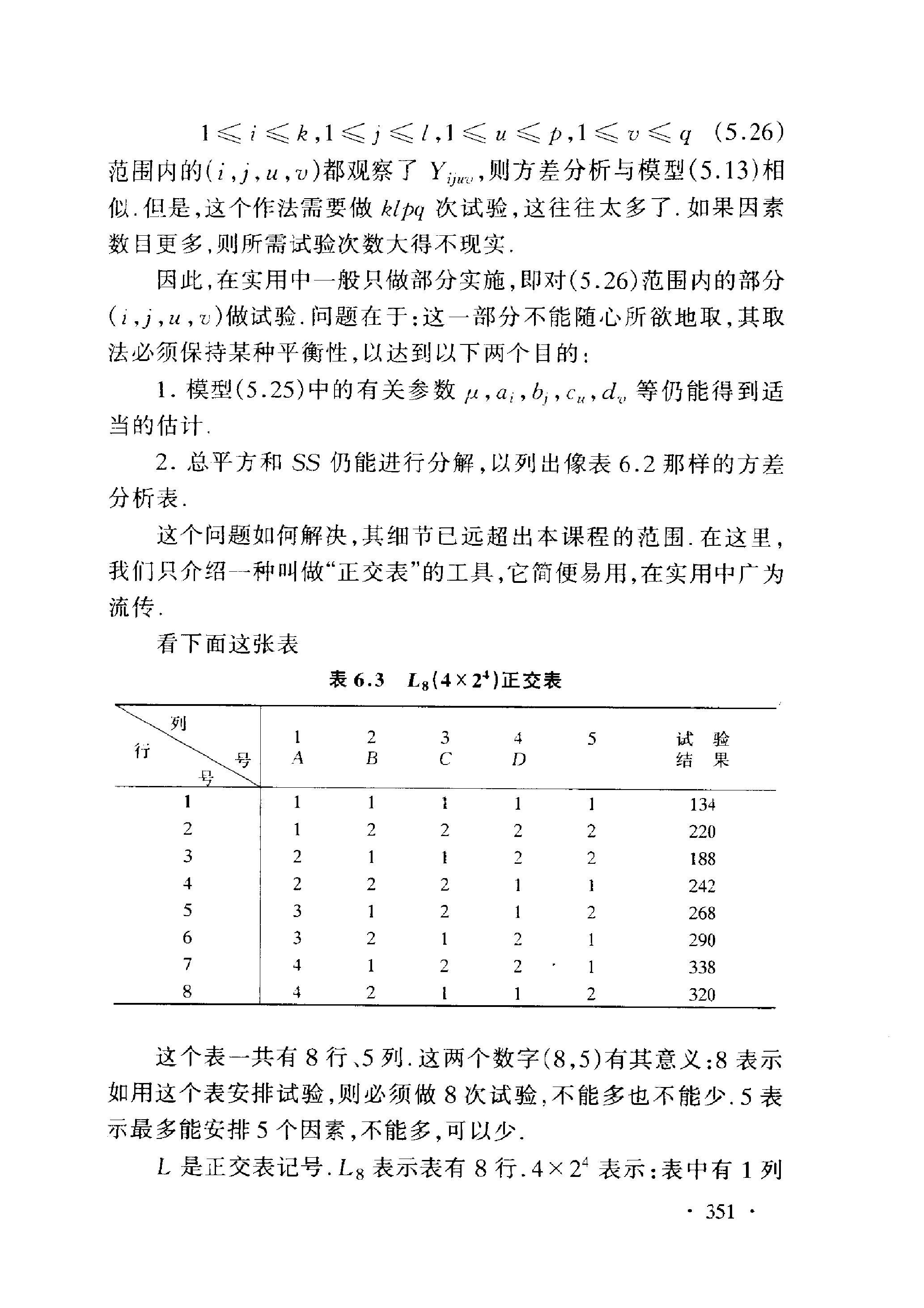 范围内的 \((i, j, u, v)\) 都观察了 \(Y_{i j w v}\), 则方差分析与模型 \((5.13)\) 相 似. 但是, 这个作法需要做 \(k l p q\) 次试验, 这往往太多了. 如果因素 数目更多,则所需试验次数大得不现实.