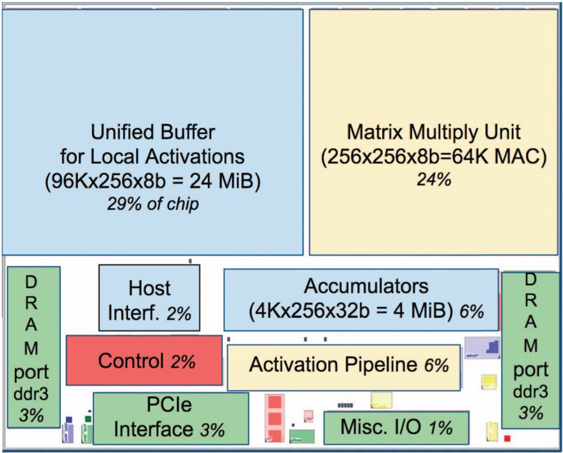 如图是TPU的平面设计简图,黄色为MMU运算单元,蓝色是统一缓存和累加器等数据单元,绿色是I/O,红色是逻辑控制单元。