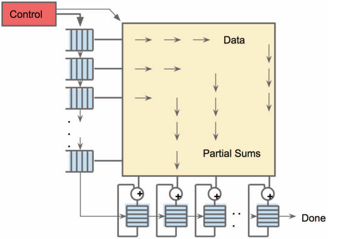 由上图可见,整个TPU中最重要的计算单元是右上角黄色的矩阵乘单元“Matrix Multiply Unit”,它包含256x256个MAC部件,每一个能够执行有符号或者无符号的8位乘加操作。它的输入为权重数据队列FIFO和统一缓冲Unified Buffer,即图中指向它的两个蓝色部分。在计算结束后,16位结果被收集并传递到位于矩阵单元下方的4MiB 32位蓝色累加器Accumulators中,之后由黄色的激活单元在累加后执行非线性函数,并最终将数据返回给统一缓冲。