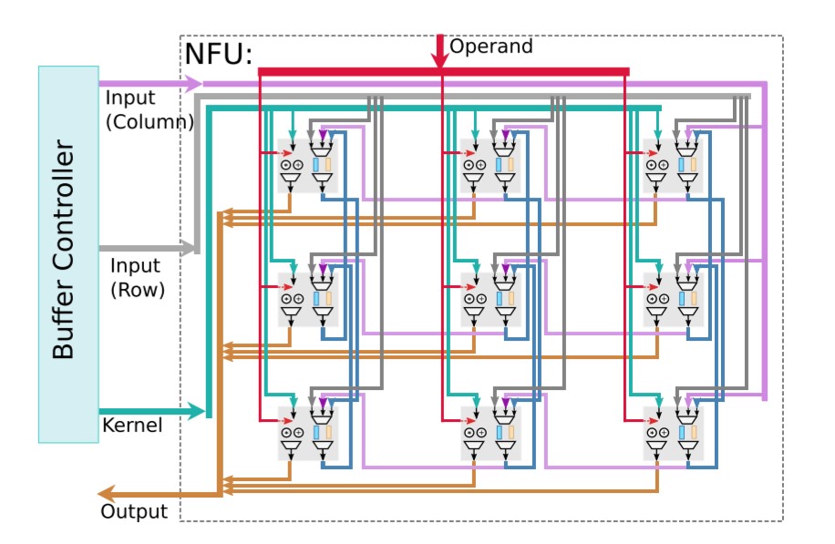 如图所示,上图中浅蓝色的部分就是用硬件逻辑模拟的神经网络架构,称为NFU(Neural Functional Units)。它可以被细分为三个部分,即途中的NFU-1,NFU-2,和NFU-3。